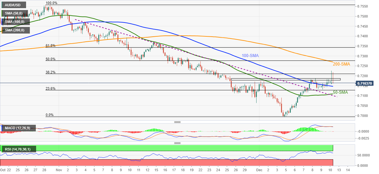 On the downside, the resistance-turned-support line and 50-SMA, respectively close to 0.7120 and the 0.7100 threshold, could stop the sellers during a pullback.