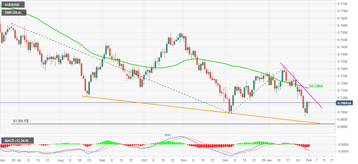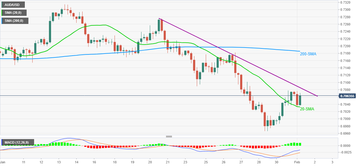 In doing so, the Aussie pair bounces off 20-SMA on the four-hour chart, around 0.7030 at the latest, to aim for a downward sloping resistance line from January 20, at 0.7085 by the press time.
