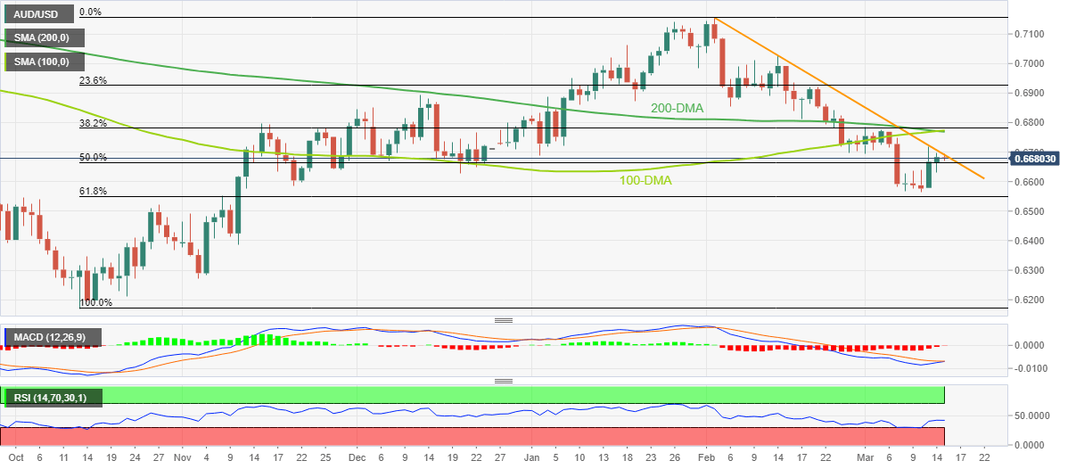 Even if the Aussie pair crosses the 0.6700 round figure, a convergence of the 100-DMA and the 200-DMA, around 0.6770-75 at the latest, appears a tough nut to crack for the bulls.
