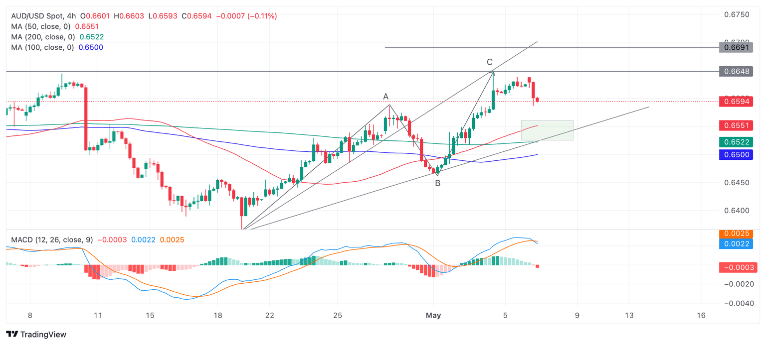 AUD/USD is trading in the 0.6590s on Tuesday as it continues correcting back from its May 3 high above 0.6600.