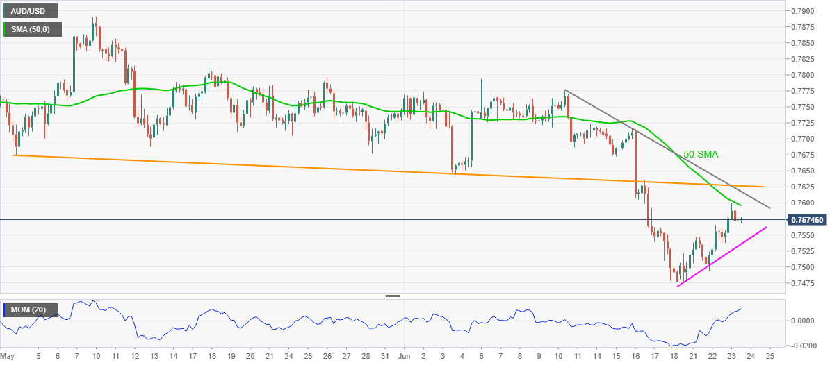 AUD/USD probes three-day uptrend below 0.7600, around 0.7575 amid Thursday’s Asian session. In doing so, the Aussie pair justifies the pullback from 50-SMA.