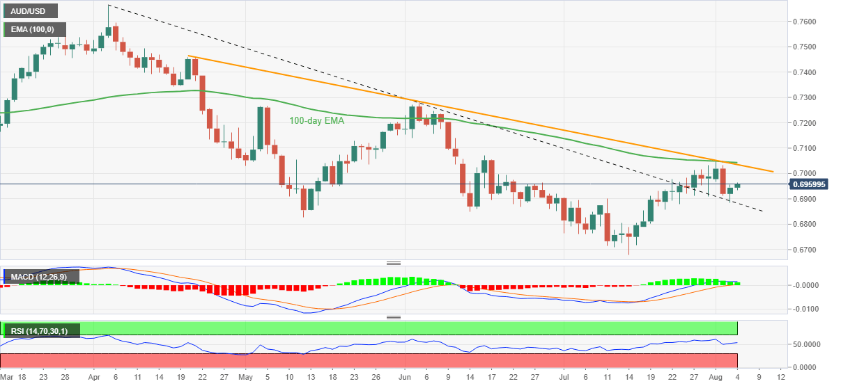 AUD/USD grinds higher around the intraday top near 0.6965 as bulls keep control during early Thursday morning in Europe. In doing so, the Aussie pair extends the previous day’s rebound from the four-month-long resistance-turned-support line.