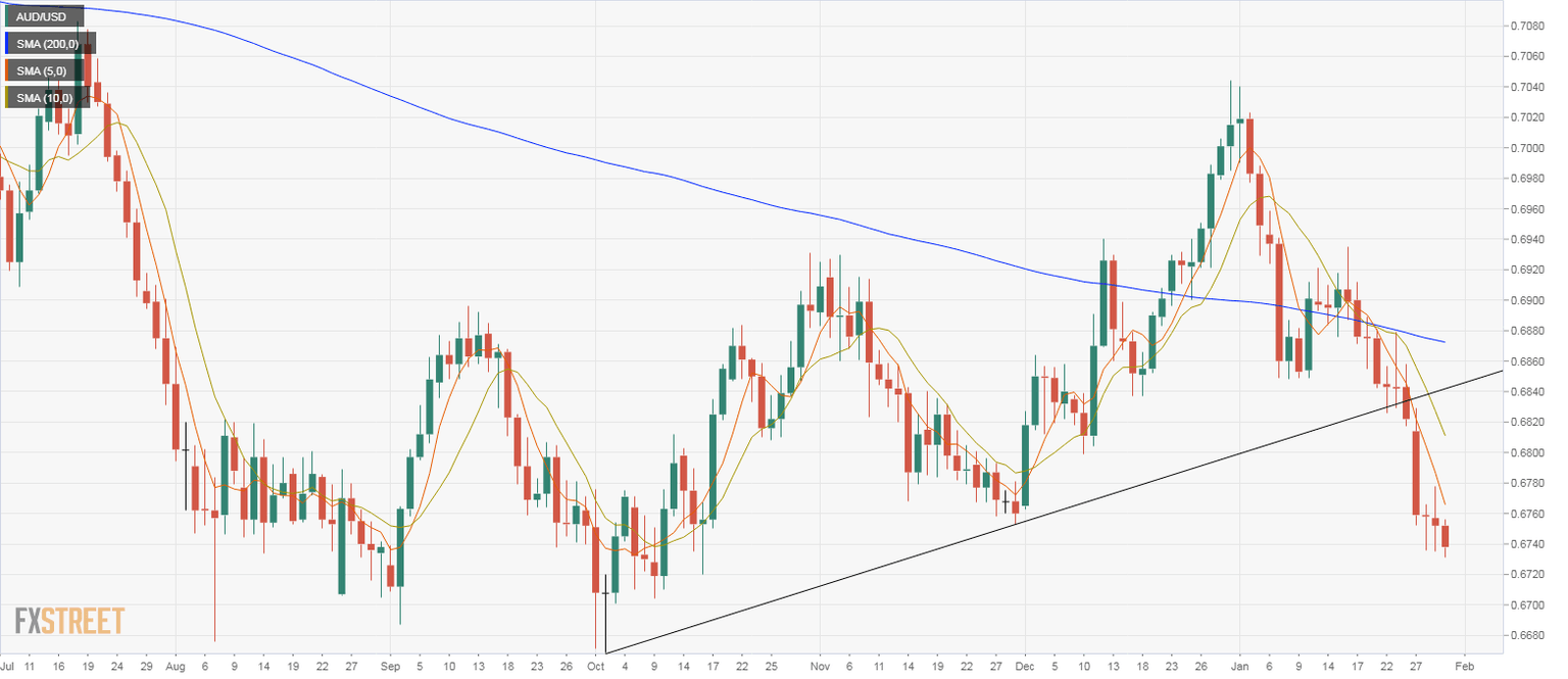 - AUD/USD drops to fresh six-month lows near 0.6730.