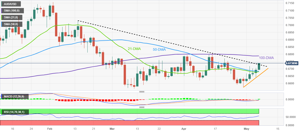 AUD/USD pierces an 11-week-old resistance line amid broad US Dollar weakness, as well as due to the hawkish signals from the Reserve Bank of Australia (RBA), during early Friday. In doing so, the Aussie pair rises to a fresh high in two weeks, around 0.6735 by the press time, as market players await the key US jobs report for April.