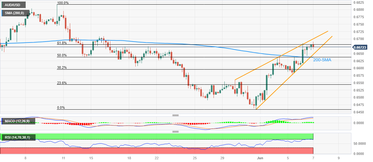 On the flip side, a successful break of the 61.8% Fibonacci retracement level of 0.6680 needs validation from the stated wedge’s top line, close to the 0.6700 round figure by the press time, to recall the AUD/USD buyers.