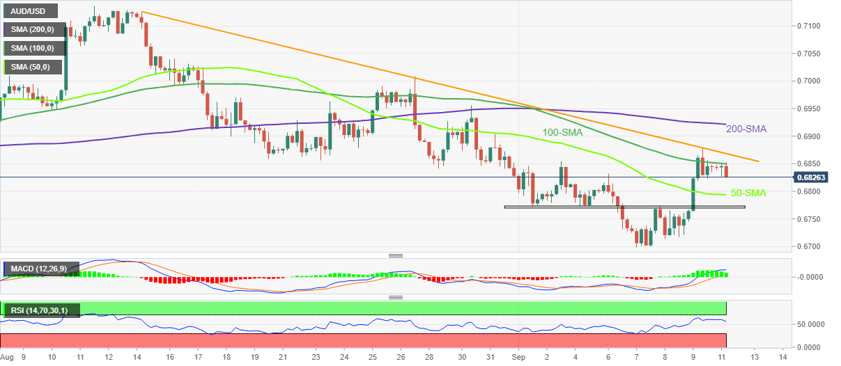 AUD/USD consolidates the biggest daily gains in a month as it refreshes intraday low around 0.6825-30 during Monday’s Asian session. In doing so, the Aussie pair takes a U-turn from the downward sloping resistance line from August 15 as well as the 100-SMA.