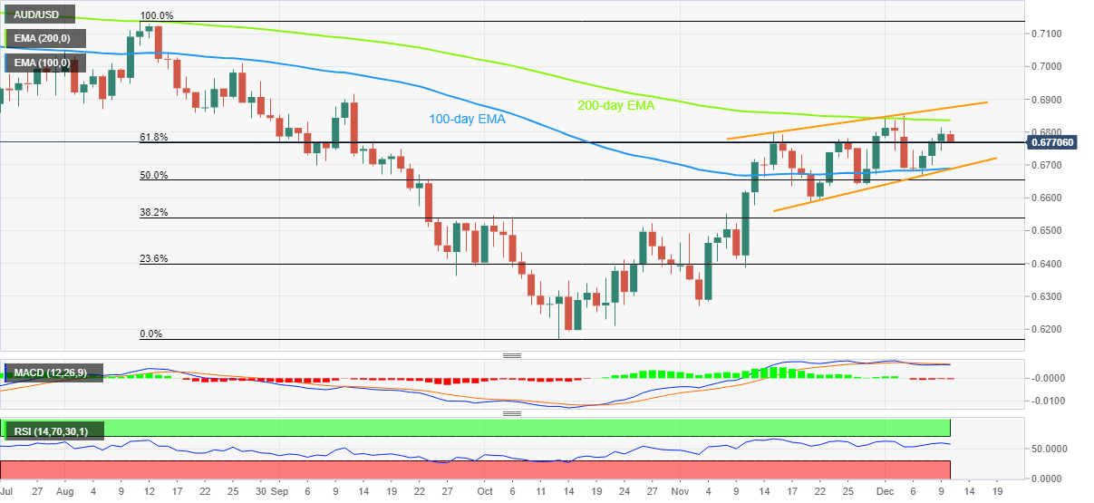 Even if the key Fibonacci retracement level, also known as the “Golden Ratio”, challenges the AUD/USD bears near 0.6770, the recently bearish MACD signals and the sluggish RSI (14) suggest the quote’s further downside. Also keeping the pair sellers hopeful is the one-month-old rising wedge bearish chart formation on the daily play.