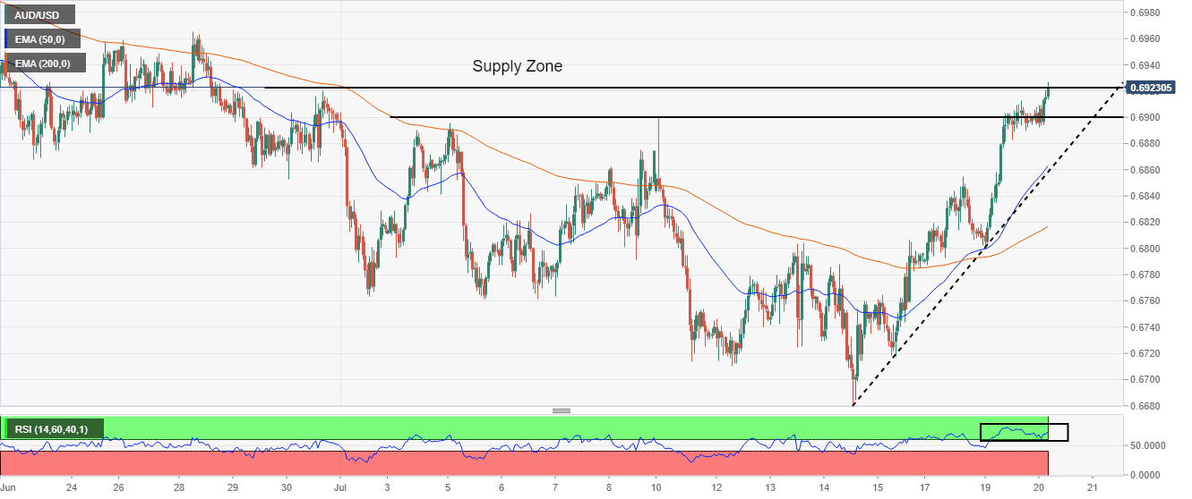 Aussie bulls have tested the critical supply zone that is placed in a narrow range of 0.6900-0.6923. The asset may attempt to establish above the same in order to shift its auction profile higher. The upward sloping trendline placed from July 14 low at 0.6680, adjoining July 15 low at 0.6734 will act as key support for the counter.
