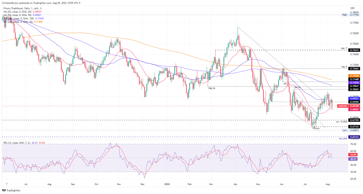 Therefore, the AUD/USD path of least resistance is downwards, and the pair’s first support would be the 0.6900 figure. Once cleared, the next stop will be the 20-day EMA at 0.6892, followed by the 0.6800 mark.