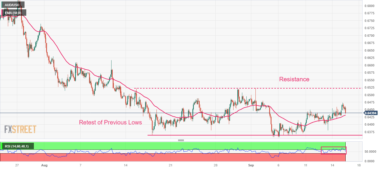 AUD/USD recovers after discovering buying interest while re-testing the horizontal support plotted from August 17 low at 0.6365. The Aussie asset climbs above the 50-period Exponential Moving Average (EMA), which trades around 0.6433. Potential resistance is plotted from August 30 high at 0.6522.