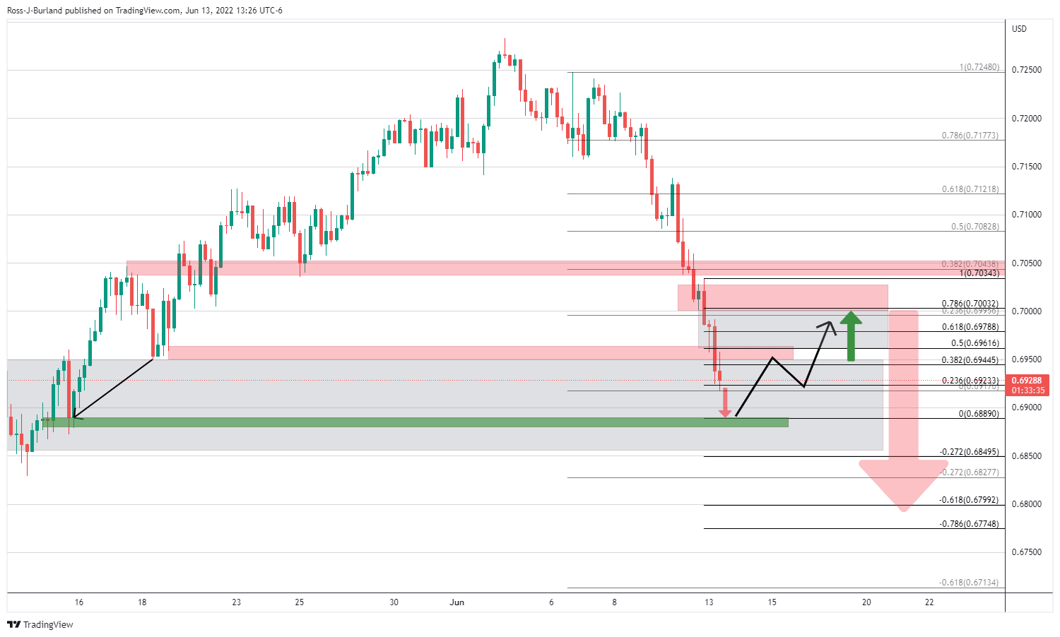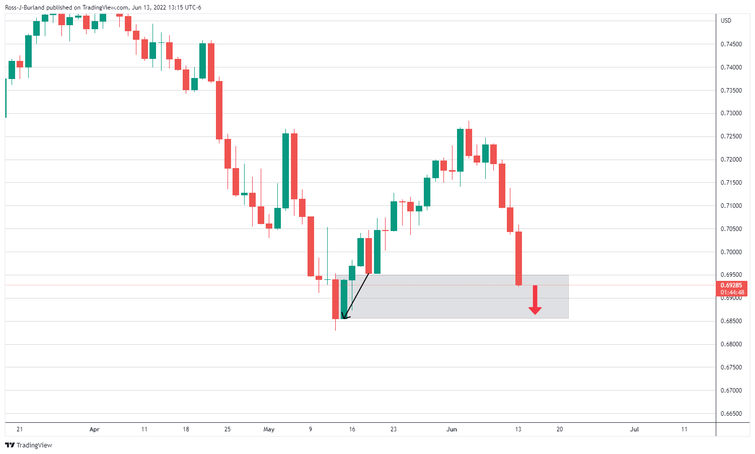 The grey area marked the price imbalance between 0.6952 and 0.7000 from where there were prospects of a bullish correction. However, as seen in the following chart, the bears are relentless and taking on a fresh area of inefficiency in price: