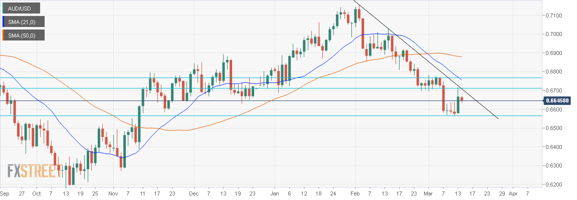AUD/USD hits the ceiling on a descending trendline after a rebound from the four-month low at 0.6564. The sharp rebounds came on Monday upon the US Dollar's weakness.
