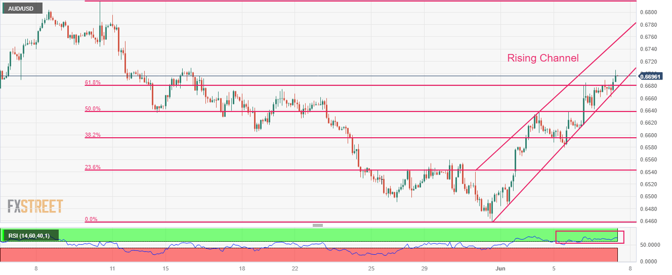 AUD/USD is auctioning in a Rising Channel on a two-hour scale in which each corrective move is considered as a buying opportunity by the market participants. The Aussie asset has comfortably shifted above the 61.8% Fibonacci retracement (plotted from May 10 high at 0.6818 to May 31 low at 0.6458) at 0.6682.