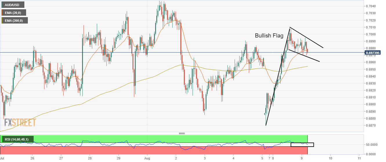 The antipodean is defending the 20-period Exponential Moving Average (EMA) at 0.6974. Also, the asset has managed to establish above the 200-EMA at 0.6954 confidently, which adds to the upside filters.