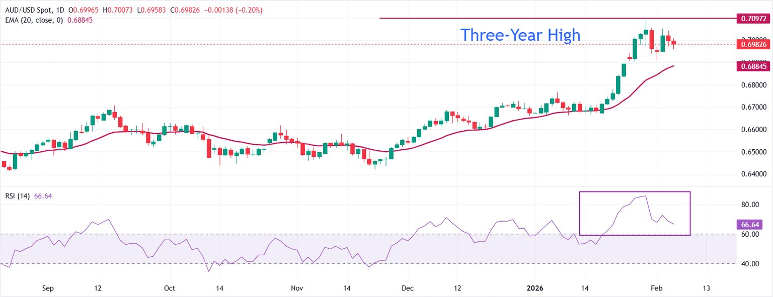 AUD/USD trades lower at around 0.6982 during the press time. The 20-day Exponential Moving Average (EMA) rises steadily, underscoring a firm bullish trend. Price holds above the 20-day EMA, with the 20-day EMA at 0.6884 providing initial support.