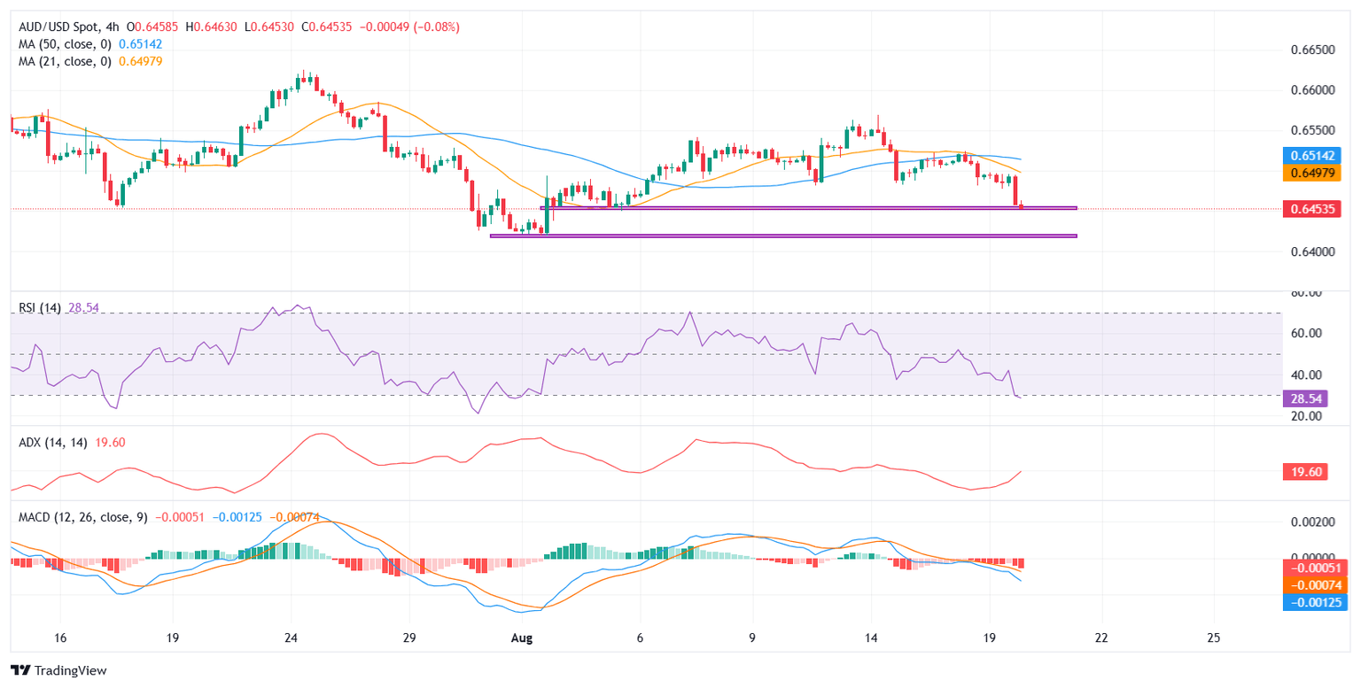 From a technical perspective, AUD/USD is currently testing support near the 0.6450 mark on the 4-hour chart. The pair has been drifting lower since briefly peaking above 0.6550 on August 14, forming a sequence of lower highs and lower lows, indicative of a short-term bearish trend.
