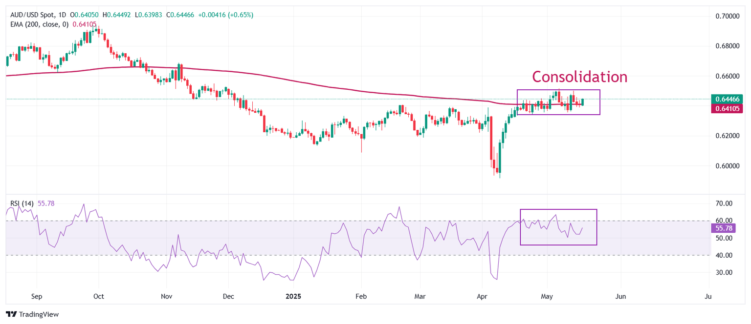 AUD/USD consolidates in a tight range of 0.6340-0.6515 for a month. The pair wobbles near the 20-day Exponential Moving Average (EMA) around 0.6410, indicating a sideways trend.