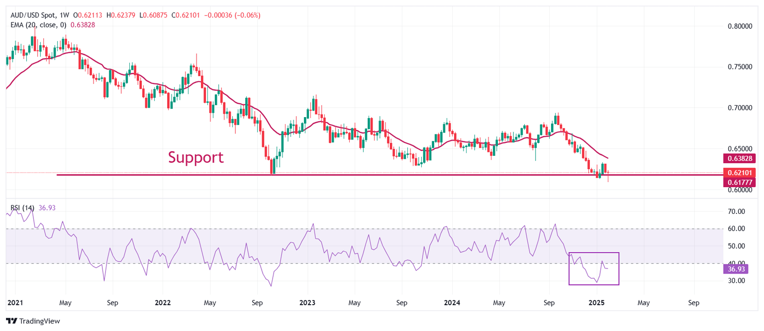 AUD/USD posts a fresh four-year low around 0.6100. The 20-week Exponential Moving Average (EMA) near 0.6375 slopes downwards, suggesting that the overall trend is bearish. The 14-week Relative Strength Index (RSI) oscillates inside the 20.00-40.00 range, indicating a strong bearish momentum.
