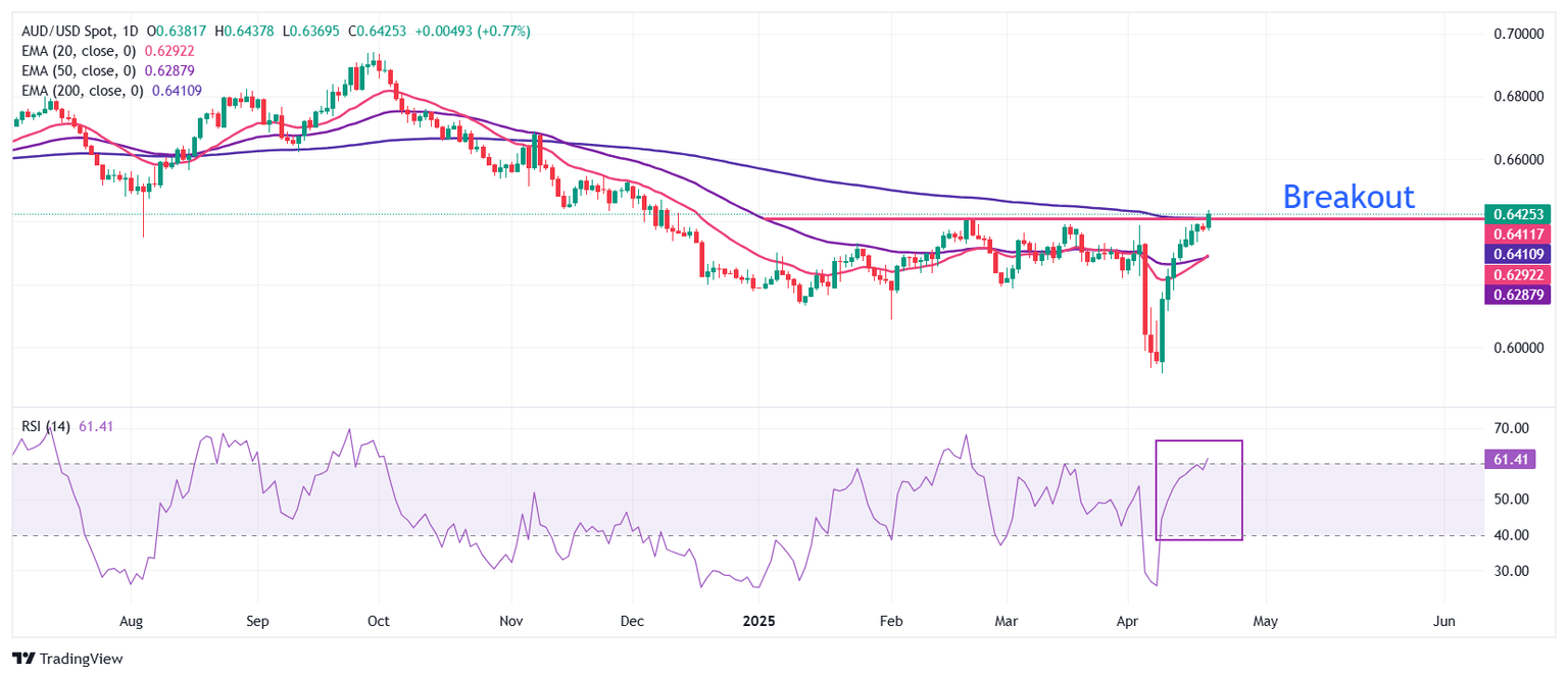 AUD/USD breaks above the key resistance of 0.6400 plotted from the February 20 high, which coincides with the 200-day Exponential Moving Average (EMA). A bull cross by the 20- and 50-day EMAs near 0.6285 indicates that the near-term trend is strongly bullish.