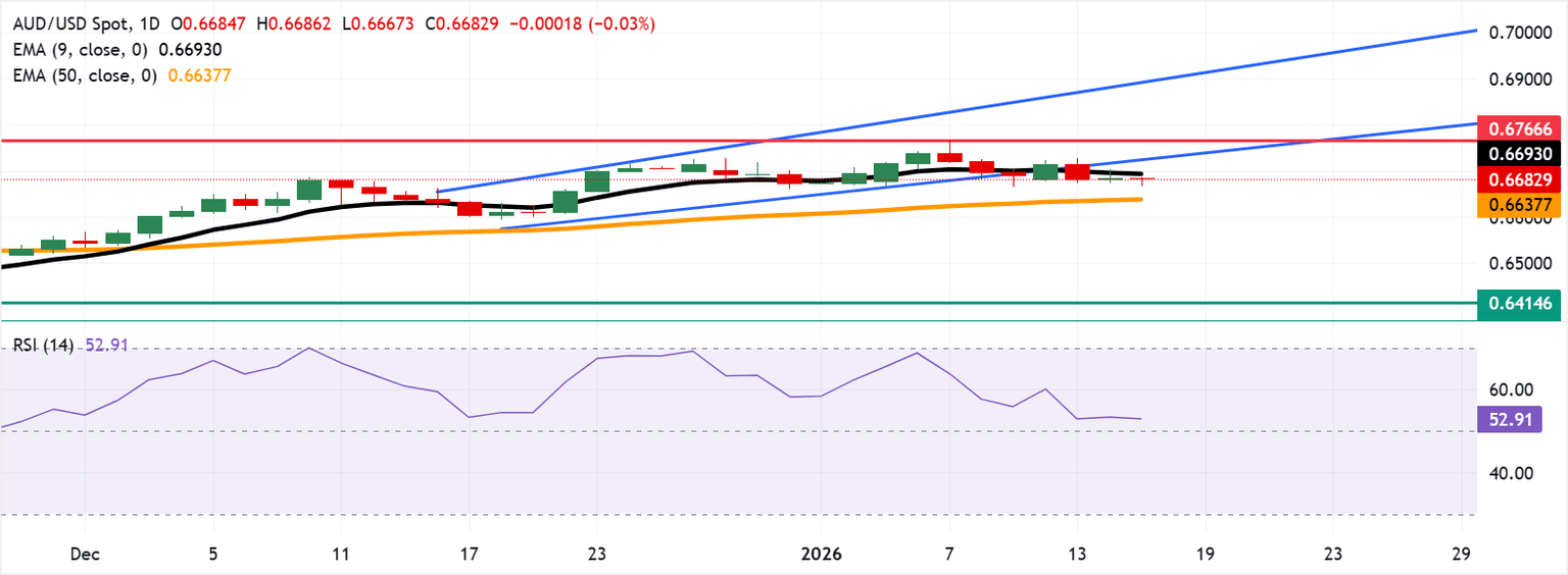 The immediate resistance lies at the nine-day EMA of 0.6693. A close above the short-term average would open room for an extension toward the ascending channel. A successful rebound within the channel would revive the bullish bias and help the AUD/USD pair to target 0.6766, its highest level since October 2024. A decisive break could open a continuation higher toward the upper boundary of the ascending channel near 0.6890.