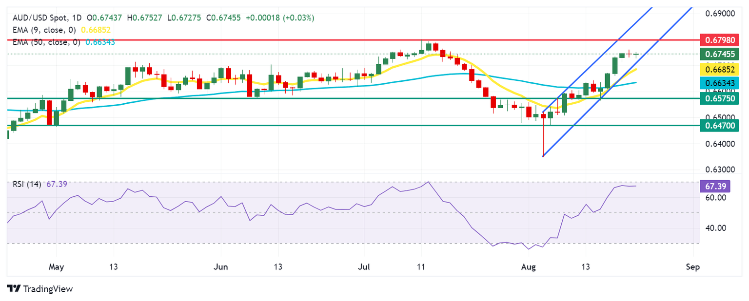 AUD/USD retraces its recent losses from the previous session, trading around 0.6750 during Thursday’s European hours. The daily chart analysis indicates that the pair trends upwards within an ascending channel pattern, reinforcing the bullish bias.