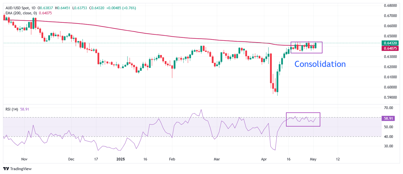 AUD/USD consolidates in a tight range of 0.6340-0.6450 for almost two weeks. The pair wobbles near the 200-day Exponential Moving Average (EMA) around 0.6407, indicating a sideways trend.