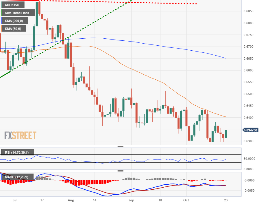 The Australian Dollar (AUD) caught a bounce from 0.6300 against the US Dollar (USD) in Monday's trading, rallying into 0.6350. The AUD/USD opened up the trading week near 0.6314, sagging into 0.6288 before catching a bid on broad-market Greenback weakness.
