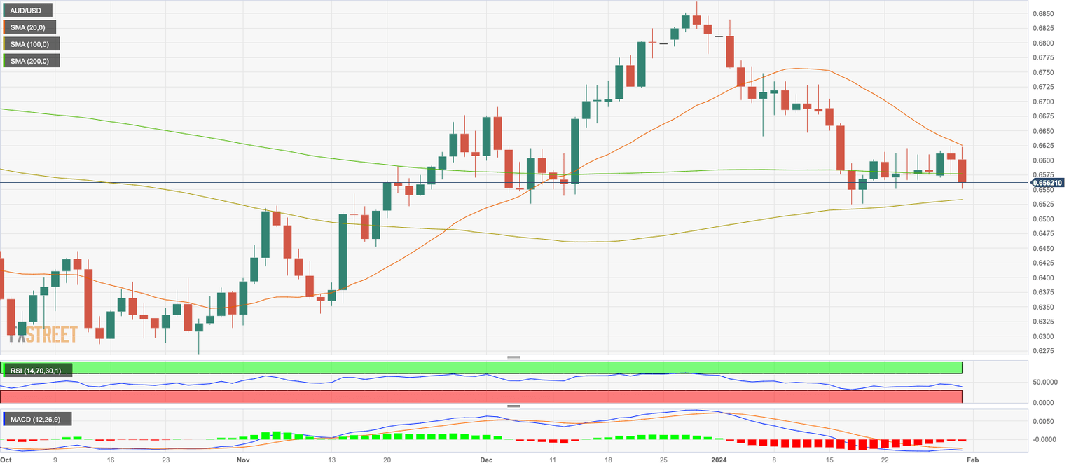 In Wednesday's session, the AUD/USD fell towards 0.6560 after initially rising above 0.6600. The Federal Reserve (Fed) didn't change its policy as expected but Jerome Powell considered that cutting in March isn't likely during its presser which made the US Dollar recover.