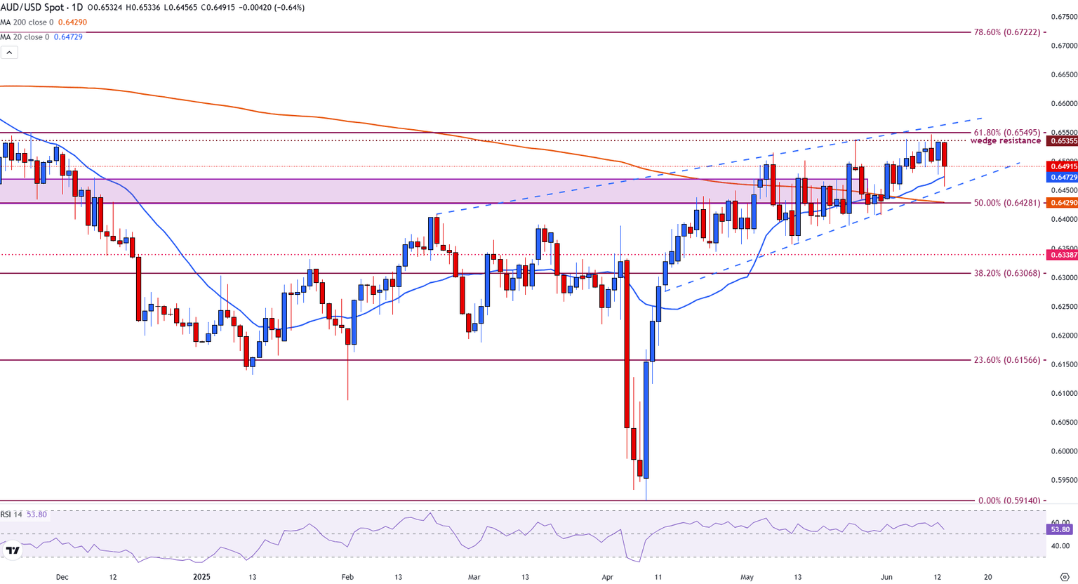 The pattern reflects fading bullish momentum and the risk of a breakdown if support levels fail to hold. Immediate support is located at the 20-day Simple Moving Average (SMA) near 0.6473, while stronger support aligns with the 200-day SMA and the 50% Fibonacci level at 0.6428.