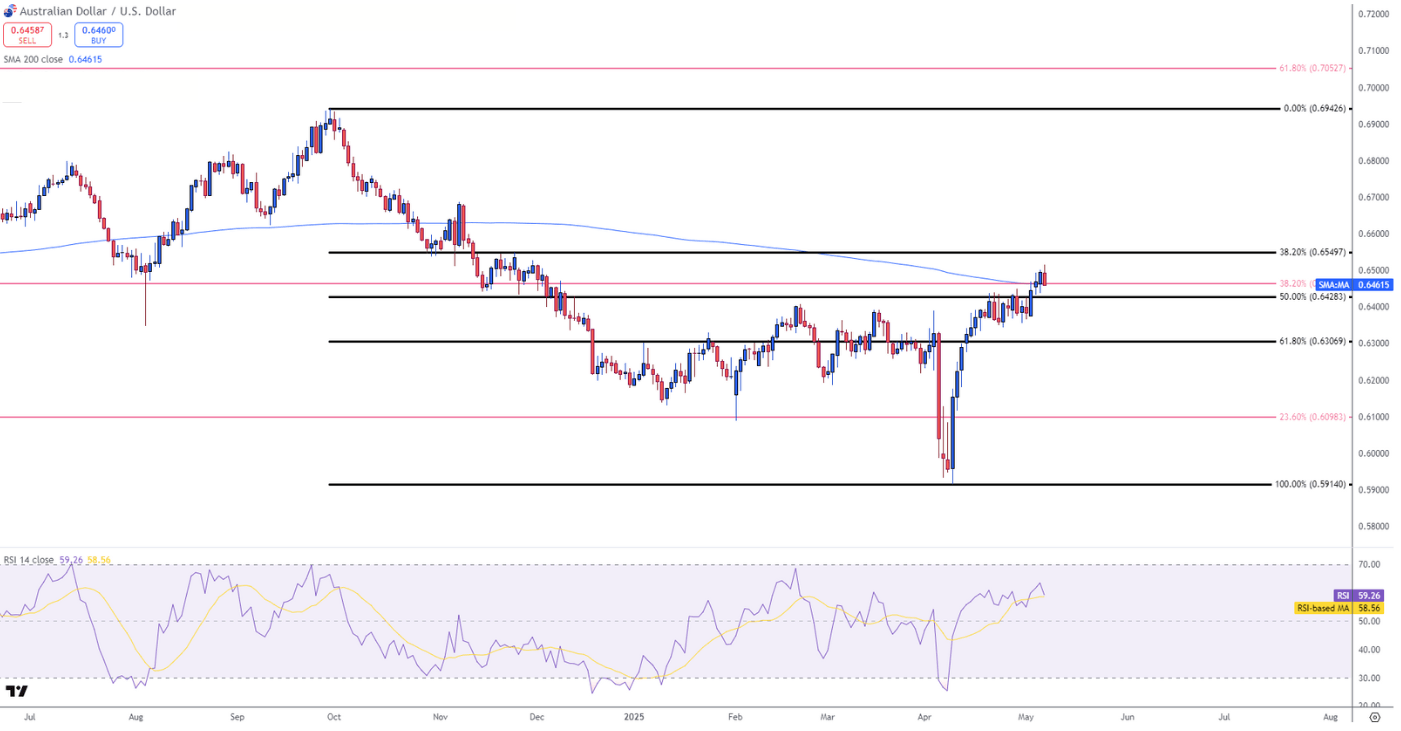 At the time of writing, the AUD/USD pair is trading at 0.6467, pulling back from the five-month high of 0.6515, just below the December 2024 peak of 0.65156.