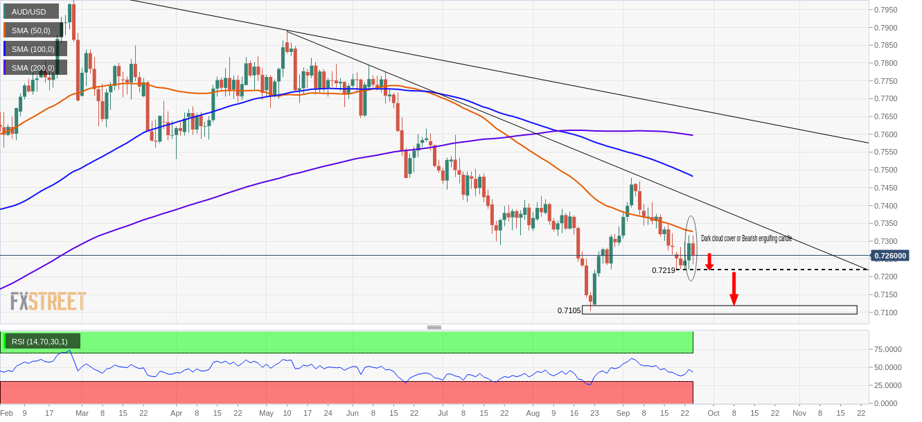 Earlier in the Asian session, the aussie was trading at daily highs around 0.7310’s, on the back of the positive market sentiment, amid the hawkishness showed by the Federal Reserve on Wednesday monetary policy statement and dot-plot. Nevertheless, Evergrande’s woes and failure to pay the dollar bond coupon changed the market’s mood to risk aversion, thus benefitting the US Dollar. At the time of writing, the AUD/USD is trading at 0.7253, recording a loss of 0.56% during the day.