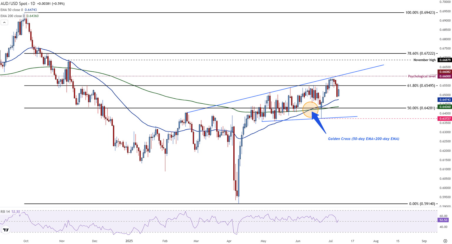 Despite this, positive momentum is still supported by the 50-day and 200-day Exponential Moving Averages (EMA), currently positioned at 0.6475 and 0.6436, respectively. The formation of a Golden Cross occurs when the 50-day EMA rises above the 200-day EMA, indicating a potential larger uptrend.