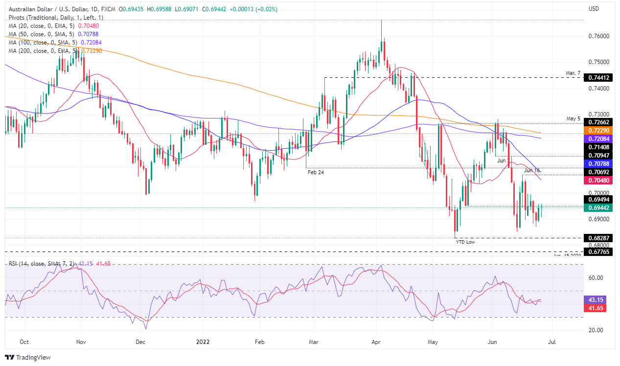 The AUD/USD seesaws in a narrow trading range, from daily highs around 0.6958 printed during the Asian session towards daily lows near 0.6910. At 0.6944, the AUD/USD trades above the middle of the aforementioned 0.6910-0.6960 region during the North American session.