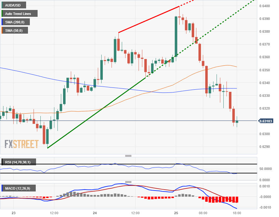 The AUD/USD hit an early high of 0.6399 on Wednesday, falling just shy of the 0.6400 handle before the Aussie (USD) went into a full reversal, sending the pair tumbling 1.4% from the day's high bids to trade back into the 0.6300 region.