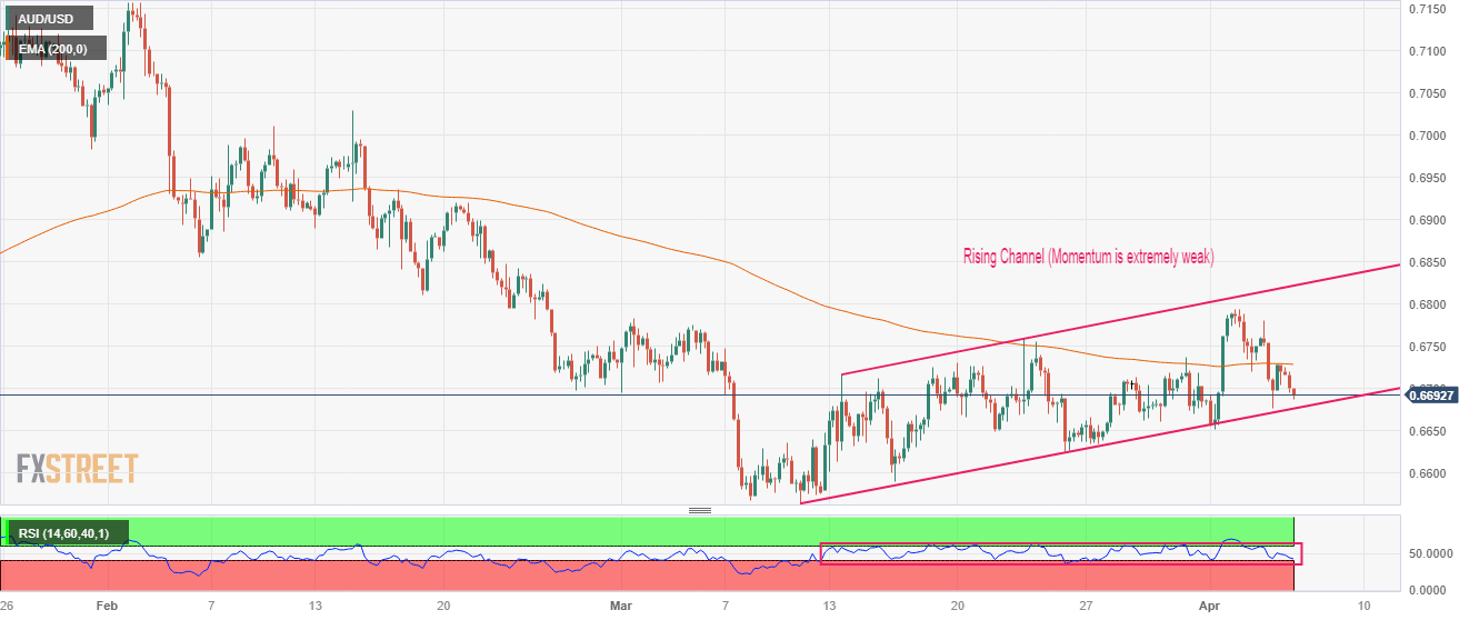 AUD/USD is auctioning in a Rising Channel chart pattern on a four-hour scale in which every corrective move is capitalized as a buying opportunity by investors. However, lack of momentum in the aforementioned chart pattern is advocating a downside move in the Aussie asset ahead.