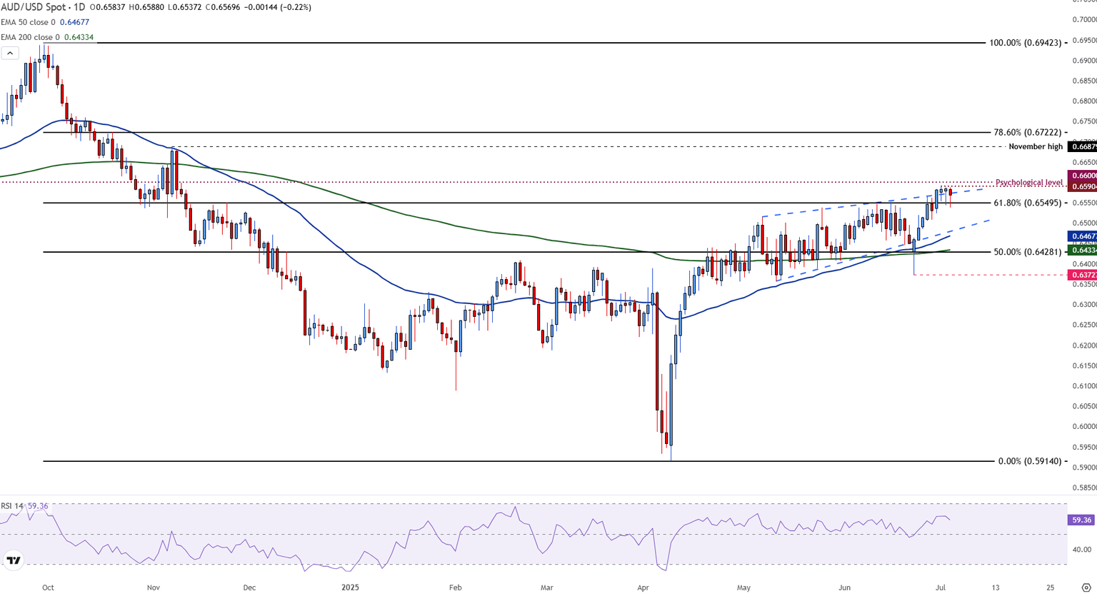 From a technical standpoint, AUD/USD continues to test the upper boundary of the rising wedge pattern on the daily chart. Failed attempts to clear 0.6590, in an effort to retest the psychological resistance at 0.6600, have resulted in a mild pullback in price action.