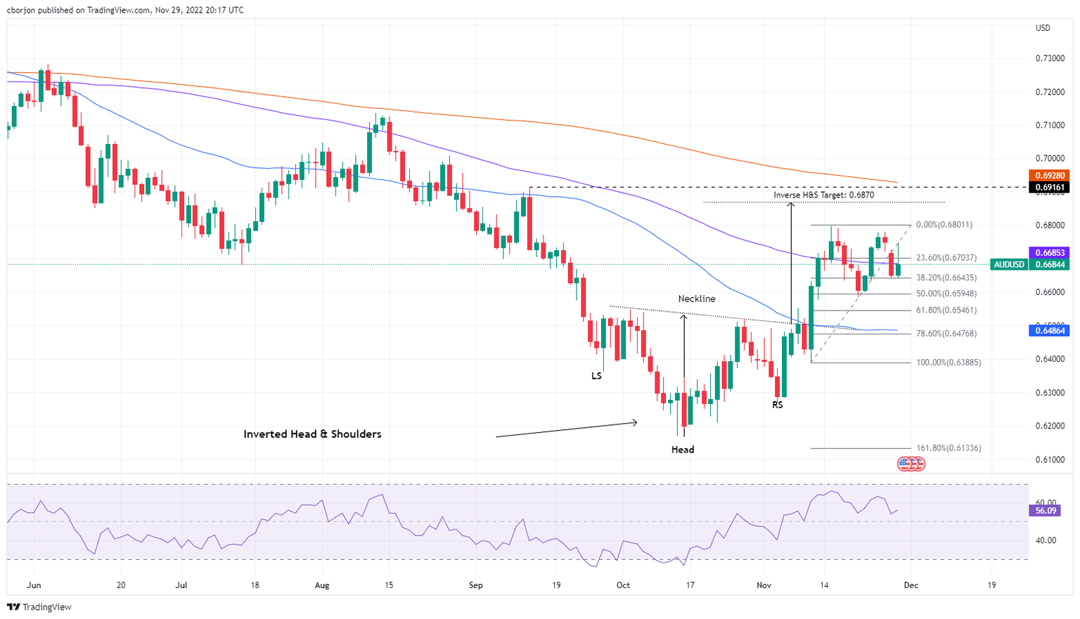 The AUD/USD remains neutral-to-upward biased, though failure to crack 0.6750 caused a 70-pip retracement on the pair, back below 0.6700. Albeit the inverted head-and-shoulders is still in play, Tuesday’s candlestick printed a sizeable upper wick, suggesting that sellers stepped in around the 23.6% Fibonacci level around 0.6703. Therefore, the AUD/USD path of least resistance near term is downwards.