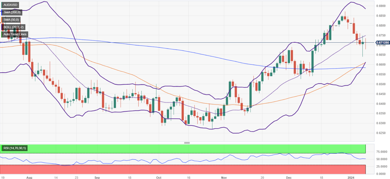 The AUD/USD turned flat during the mid-North American session on Monday after hitting a daily low of 0.6677, but an improvement in traders' appetite weakened the Greenback (USD). Additionally, speculations that the US Federal Reserve (Fed) would cut rates in 2024 remain shy, a headwind for the USD. At the time of writing, the pair trades at 0.6713, almost flat.