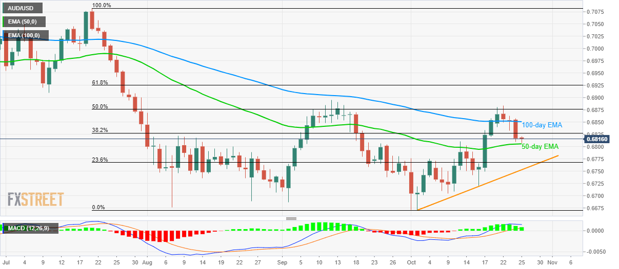 While failure to cross 50% Fibonacci retracement of July-October downside dragged the AUD/USD pair to weekly low, pair’s further downside seems questionable as it takes the rounds to 0.6815 amid initial trading session on Friday.