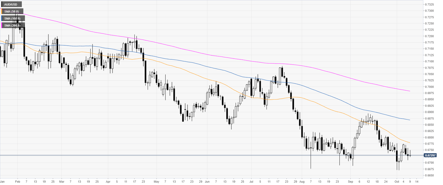 The AUD/USD exchange rate is trading below the main SMAs on the four-hour chart, suggesting bearish momentum in the medium term. A break below the 0.6720 support level can generate a move down to the 0.6700 figure, according to the