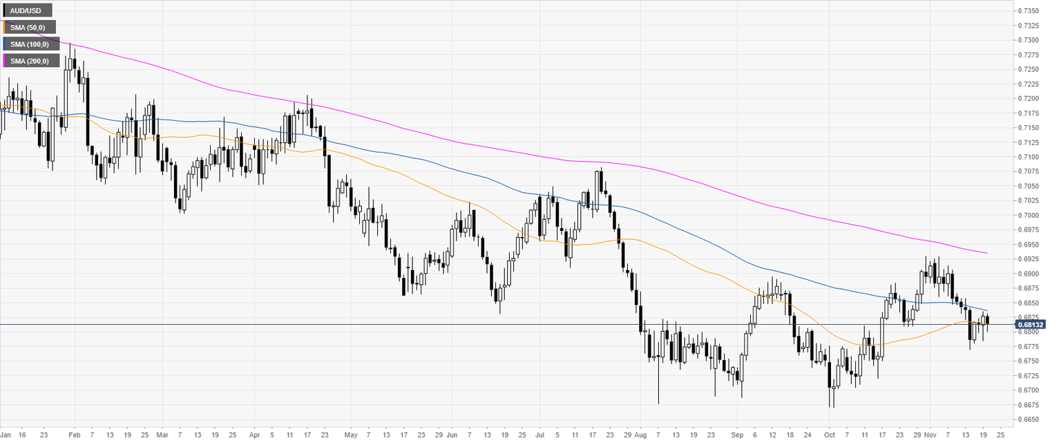 AUD/USD is trading in a bear trend below the 100 and 200-day simple moving averages (DMAs) on the daily chart. This Wednesday, the Aussie is trapped in a tight range ahead of the FOMC minutes at 19:00 GMT.