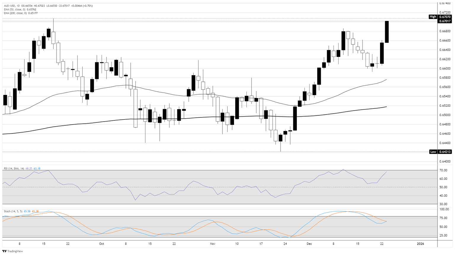 - AUD/USD added 0.66% on Tuesday as market sentiment tilts bullish ahead of the holidays.