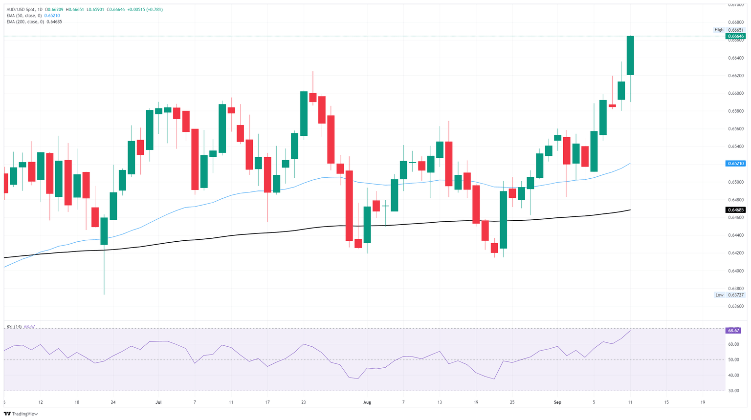 AUD/USD knocked into another new ten-month peak on Thursday, clocking in an intraday peak above 0.6650 for the first time since last November. The Australian Dollar (AUD) rose around three-quarters of one percent against the US Dollar (USD) for the day, bringing its latest bullish swing from its last swing low to nearly 4%. AUD/USD has risen over 3.8% from its late August low of 0.6414.