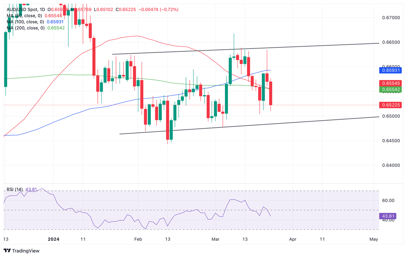 AUD/USD is trading back down at the bottom or its multi-week range in the lower 0.6500s on Friday, after positive US data led to a reversal in the pair from its 0.6634 Thursday highs.