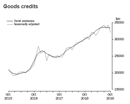 In trend terms, the balance on goods and services was a surplus of $6,341m in October 2019, a decrease of $229m on the surplus in September 2019. In seasonally adjusted terms, the balance on goods and services was a surplus of $4,502m in October 2019, a decrease of $2,345m on the surplus in September 2019.