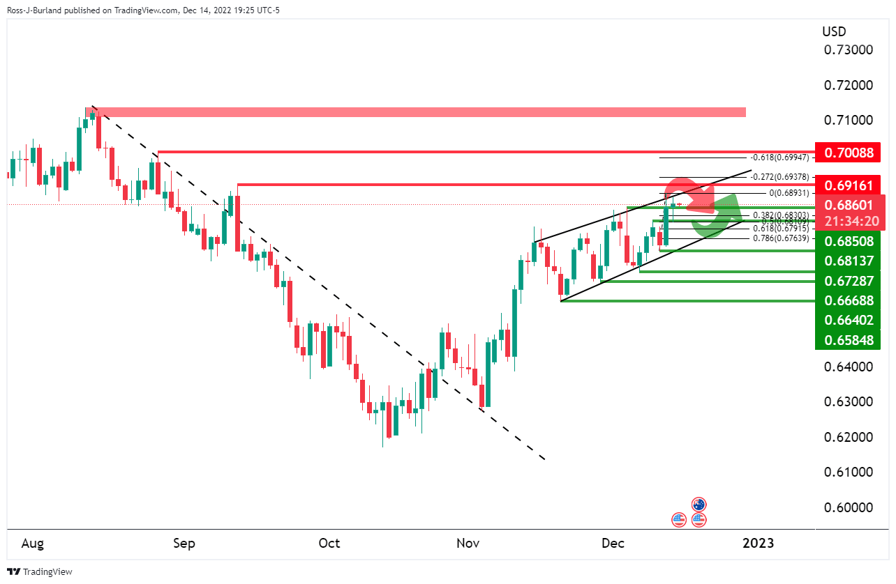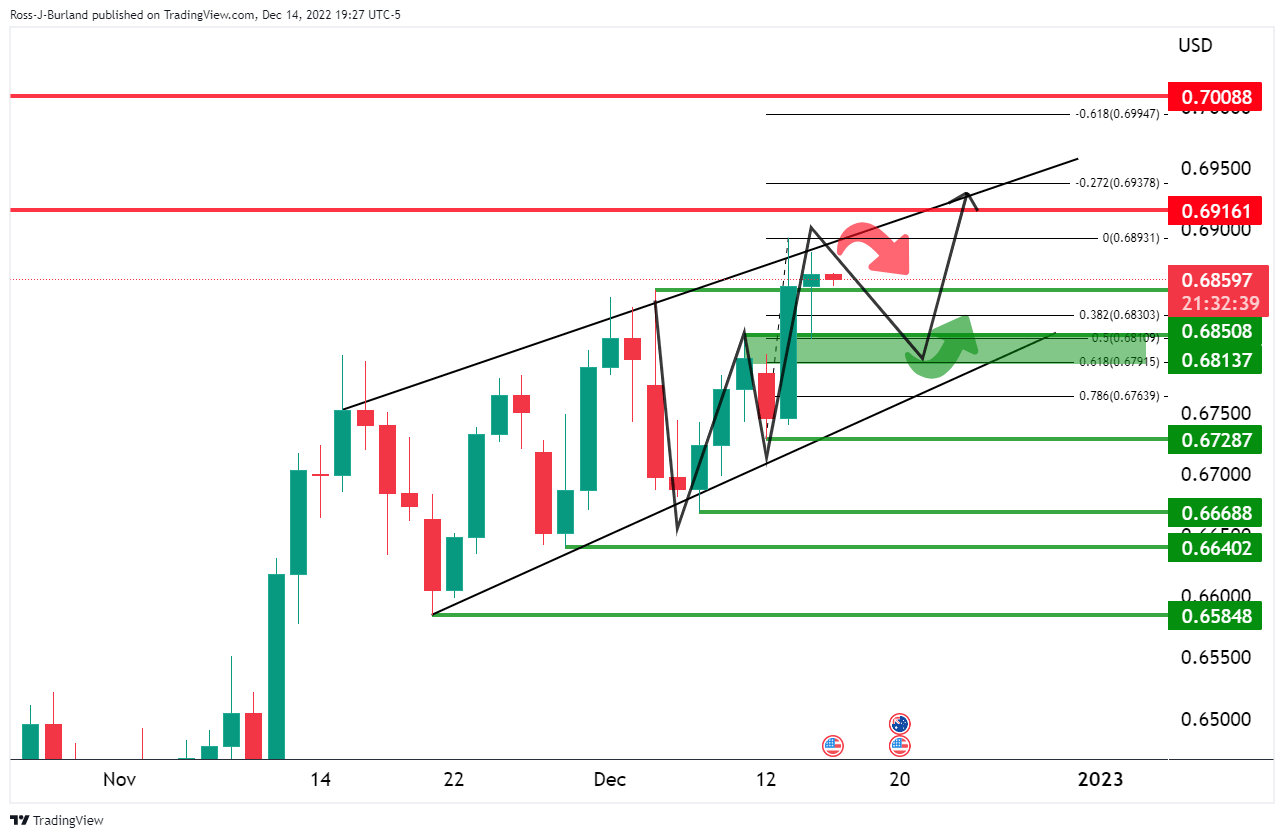 After an initial move lower on the Federal Reserve, AUD/USD finished relatively flat for the US session. It was trading at 0.6860 ahead of the Aussie jobs data, testing the resistance of the bullish channel on the daily chart as follows: