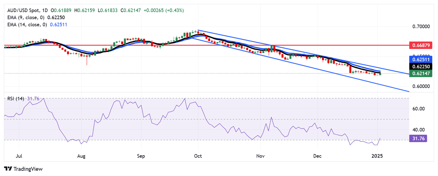 The AUD/USD pair trades near 0.6210 on Thursday, maintaining a bearish outlook on the daily chart as it trades within a descending channel pattern. The 14-day Relative Strength Index (RSI) has rebounded above 30, hinting at the possibility of a near-term upward correction.