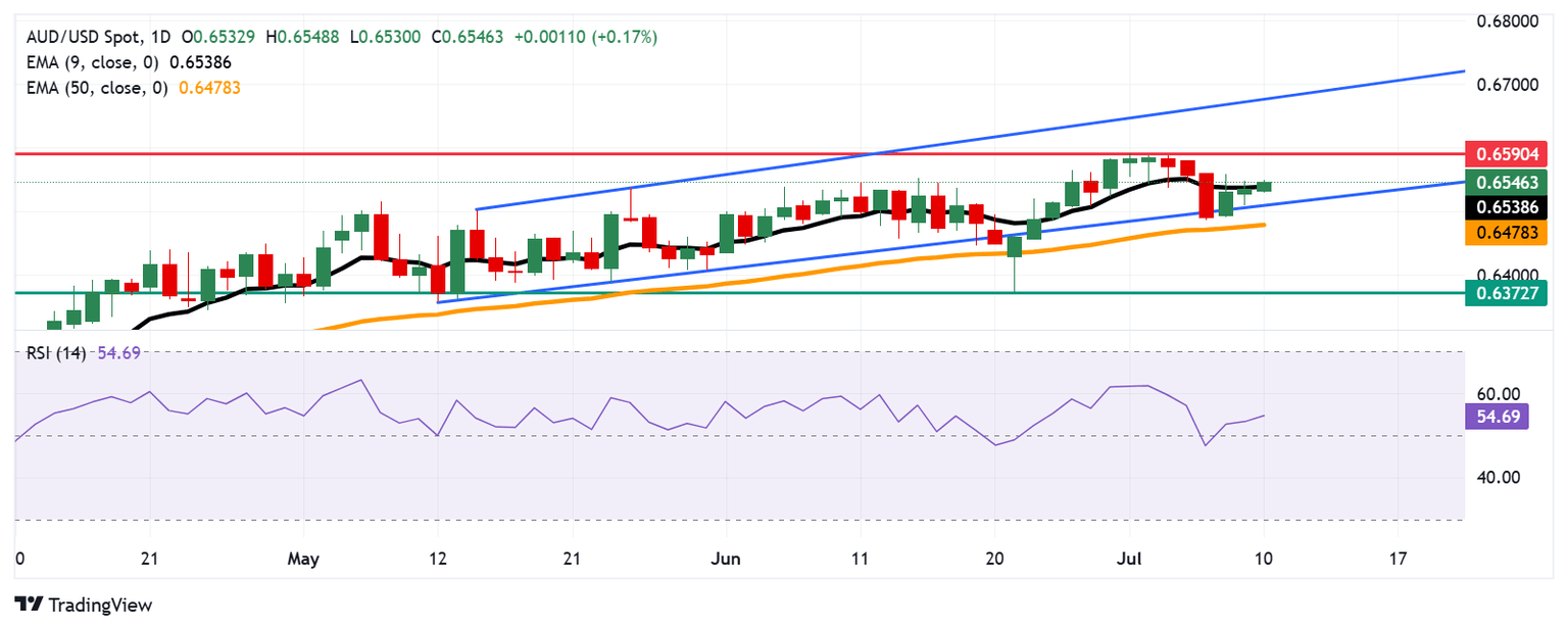 The AUD/USD pair is trading around 0.6540 on Thursday. The daily chart’s technical analysis indicated a persistent bullish sentiment as the pair remains within the ascending channel pattern. The 14-day Relative Strength Index (RSI) is positioned above the 50 mark, strengthening the bullish bias. Additionally, the pair has moved slightly above the nine-day Exponential Moving Average (EMA), indicating that short-term price momentum is strengthening.