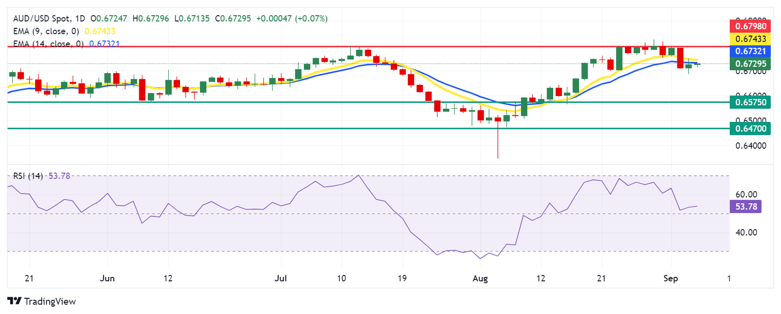 The Australian Dollar trades around 0.6720 on Thursday. Analyzing the daily chart, the AUD/USD pair is positioned below the nine-day Exponential Moving Average (EMA), suggesting a short-term pause amid the overarching upward momentum. Also, the 14-day Relative Strength Index (RSI) remains above the 50 level, suggesting that the asset price is leaning toward the bullish side.