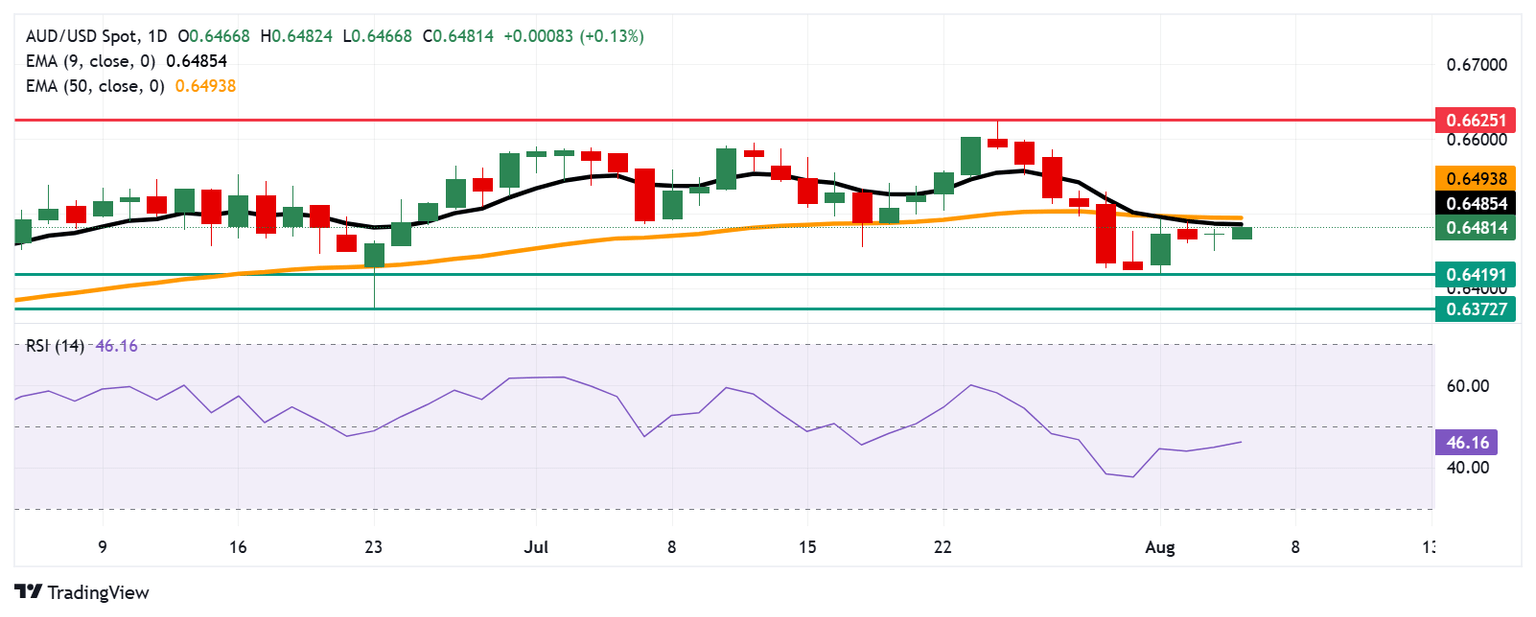 The AUD/USD pair is trading around 0.6480 on Wednesday. Technical analysis on the daily chart suggests a bearish bias, with the 14-day Relative Strength Index (RSI) holding below the 50 level. The pair is also positioned below the nine-day Exponential Moving Average (EMA), signaling weakening short-term momentum.